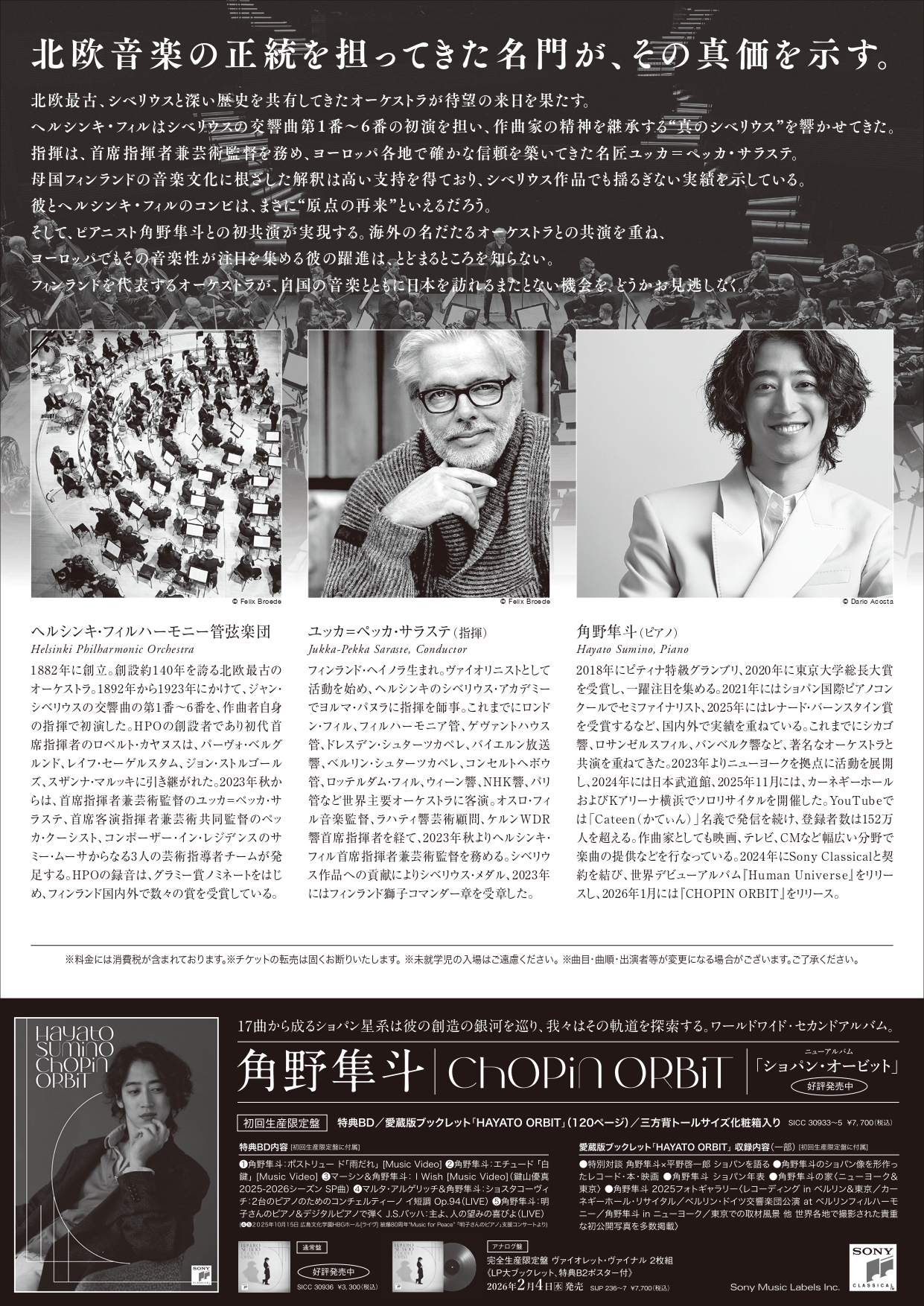 指揮は、首席指揮者兼芸術監督を務め、ヨーロッパ各地で確かな信頼を築いてきた名匠ユッカ=ペッカ・サラステ。母国フィンランドの音楽文化に根ざした解釈は高い支持を得ており、シベリウス作品でも揺るぎない実績を示している。彼とヘルシンキ・フィルのコンビは、まさに“原点の再来”といえるだろう。