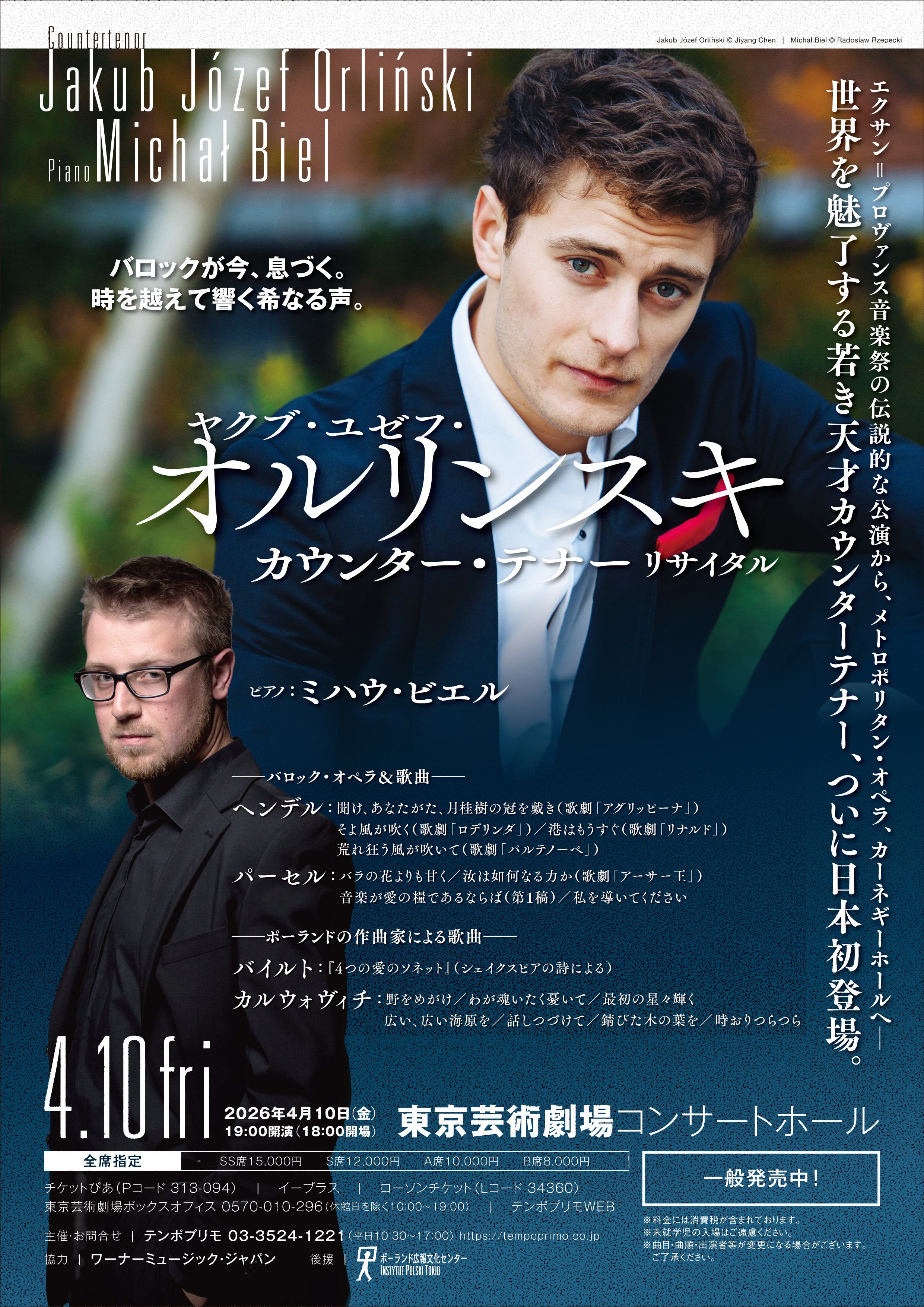 2025年11月28日公演情報tempoprimo【公演情報】ヤクブ・ユゼフ・オルリンスキ(カウンター・テナー)ヤクブ・ユゼフ・オルリンスキの公演情報を公開しました。 世界を魅了する若き天才カウンターテナーが、ついに日本初登場。 バロックが今も息づく歌声を、ぜひ会場でお楽しみください。